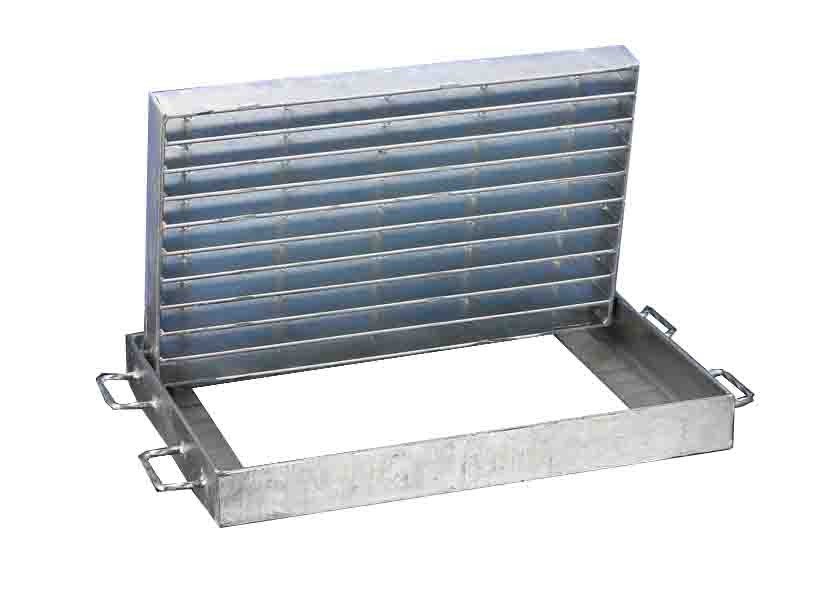 GM 型井孔地沟(排水、篦子)沟盖板。GM 型井孔地沟(排水、篦子)沟盖板一般可设计成可翻式,通常可翻的启闭角为 110度。带铰销的地沟(排水、篦子)沟盖板不仅防盗而且简化了施工程序,为了提高抗冲击能力,GM 型井孔地沟(排水、篦子)沟盖板一般采用横杆间距为 50mm 的地沟(排水、篦子)沟盖板来制造。